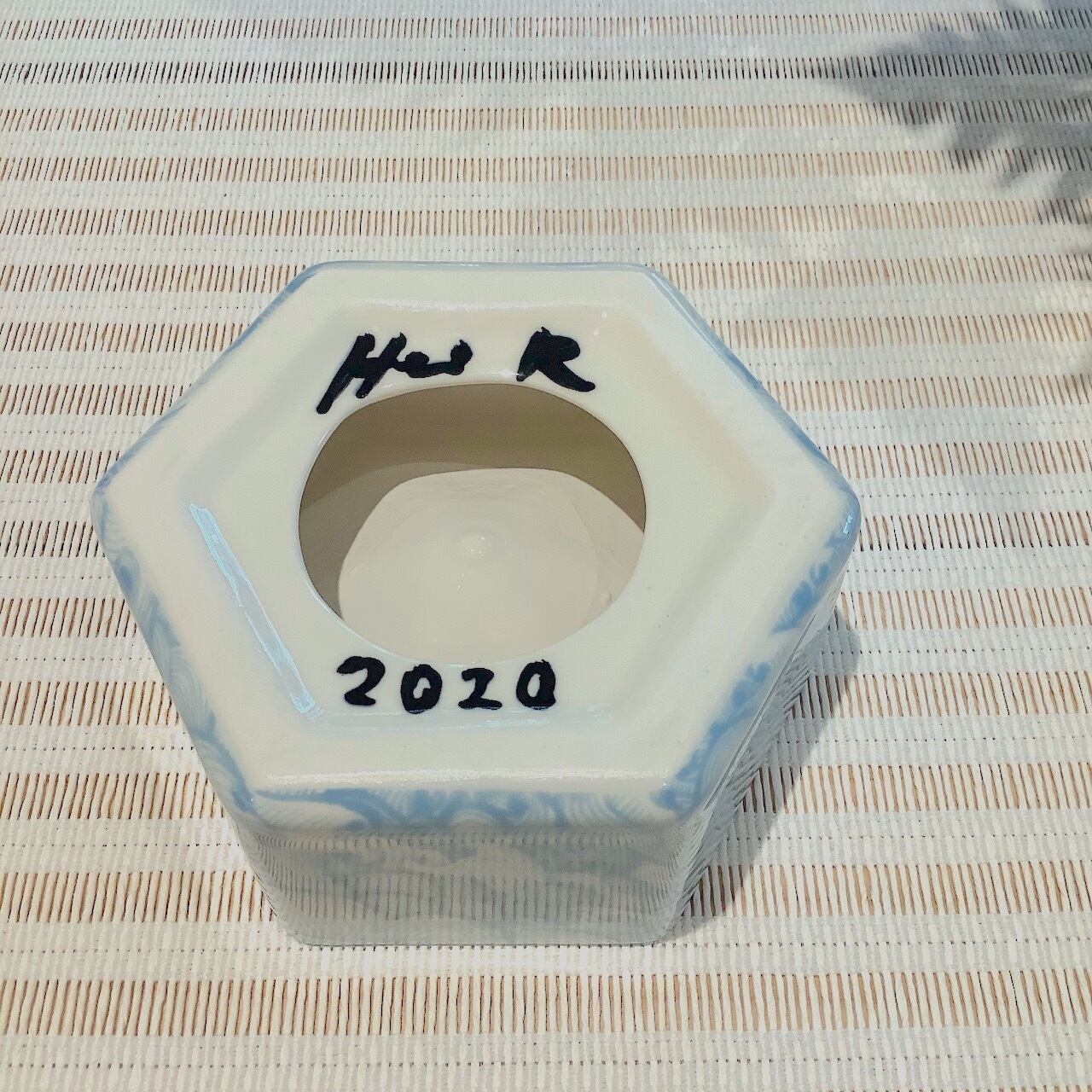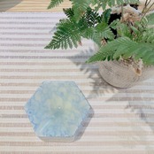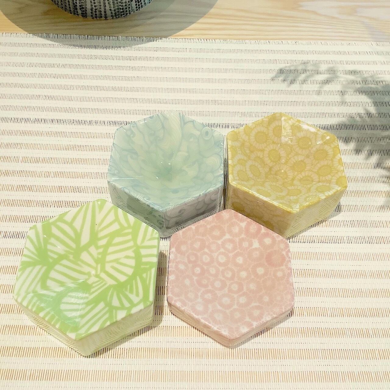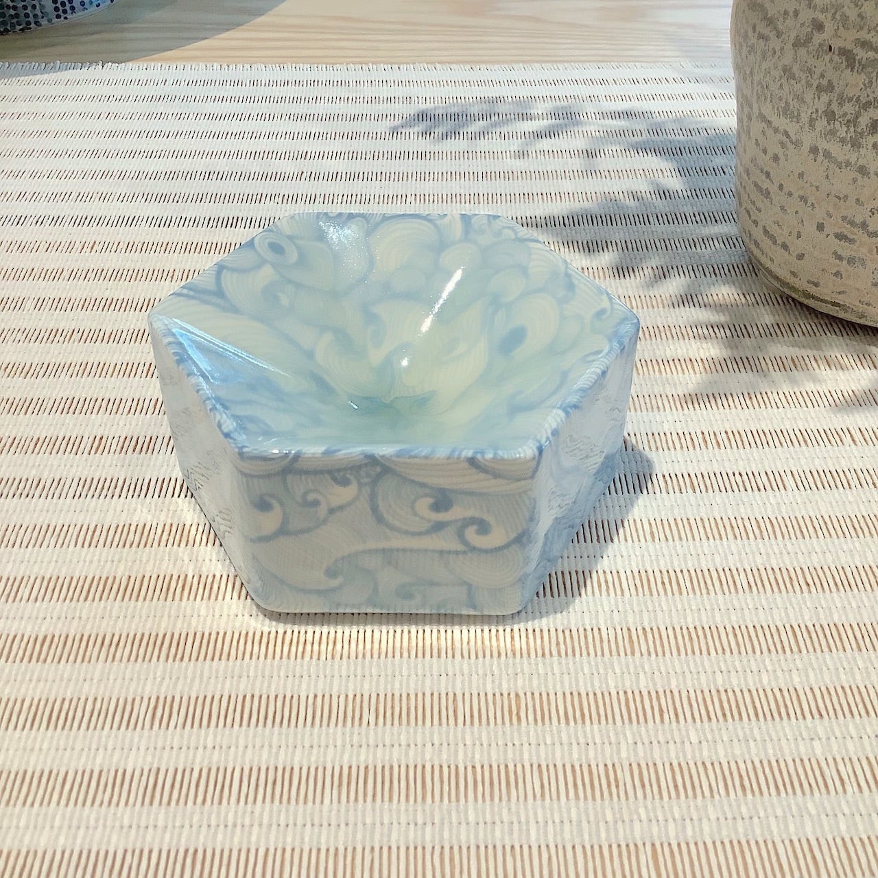 淡いブルーで水や波を思わせるパターンのヘキサゴンディッシュです。真ん中の窪んだ部分は透明感のある釉溜まりがあり、うっすらと緑がかっています。ミルキーで柔らかな色合いがたまりません。