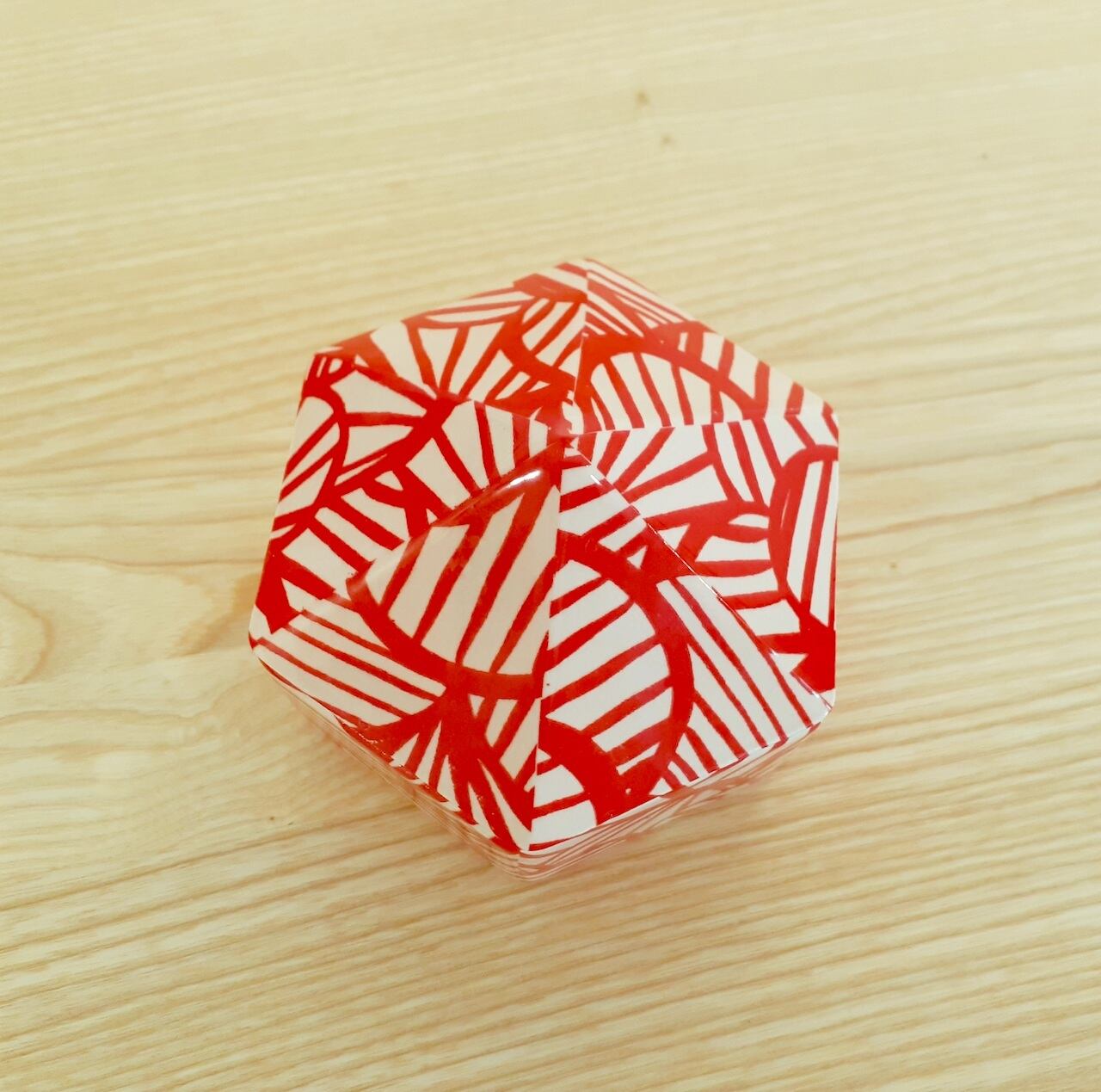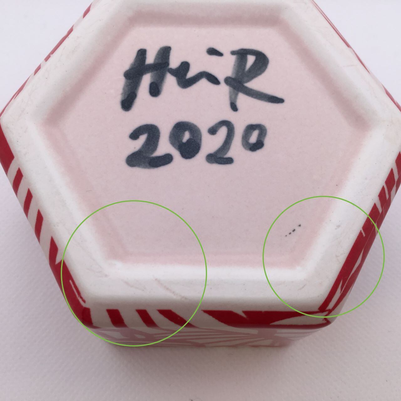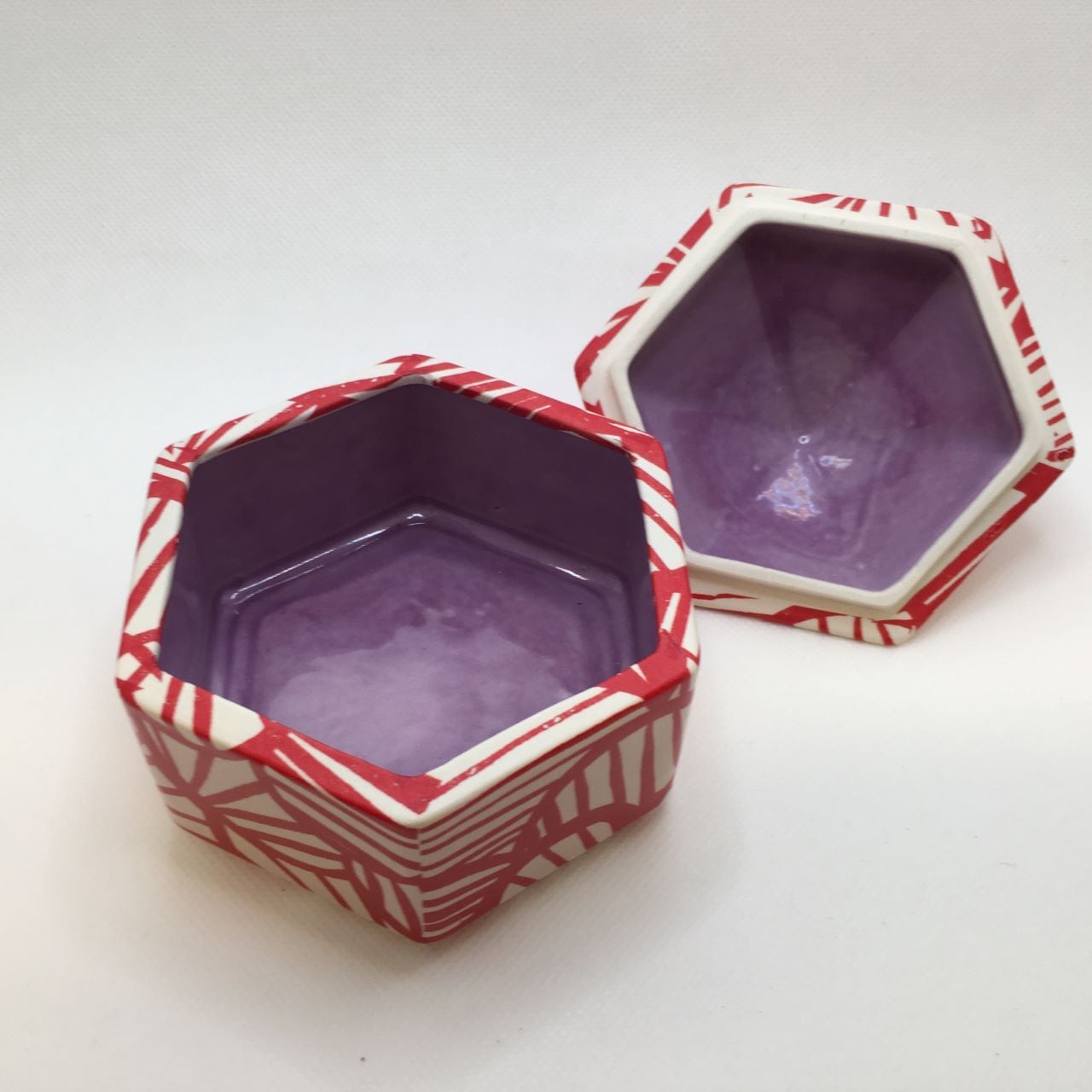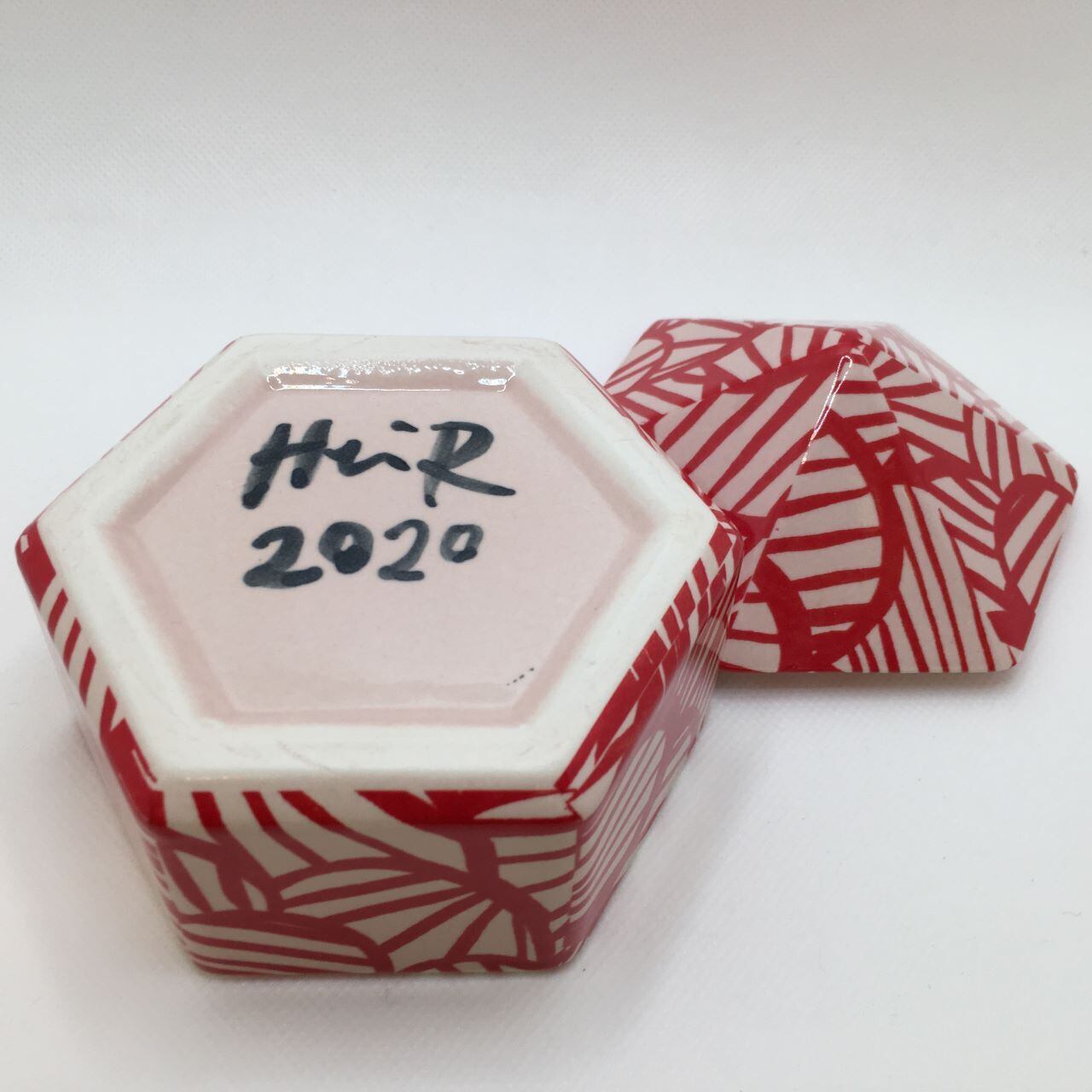 北欧を代表する陶器メーカーARABIA社の人気アーティスト、ヘイニ・リータフフタのセラミックアートです。ヘイニさんが頻繁に用いる六角形(ヘキサゴン)の蓋物です。