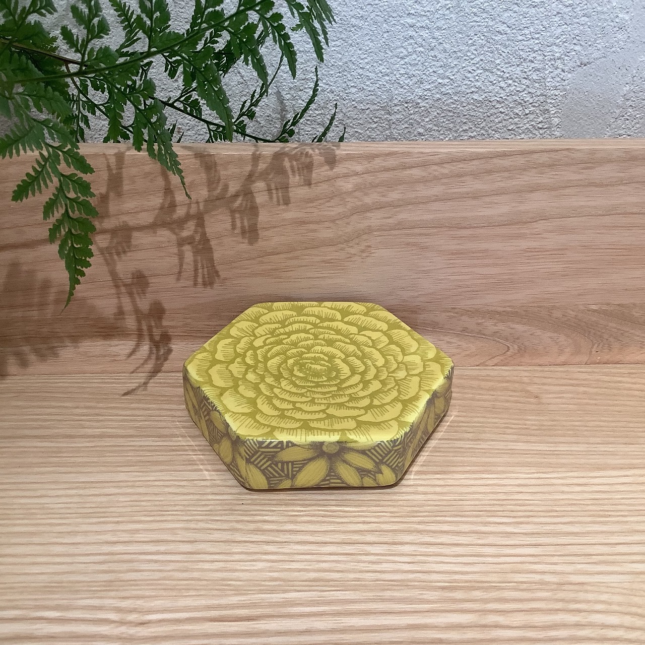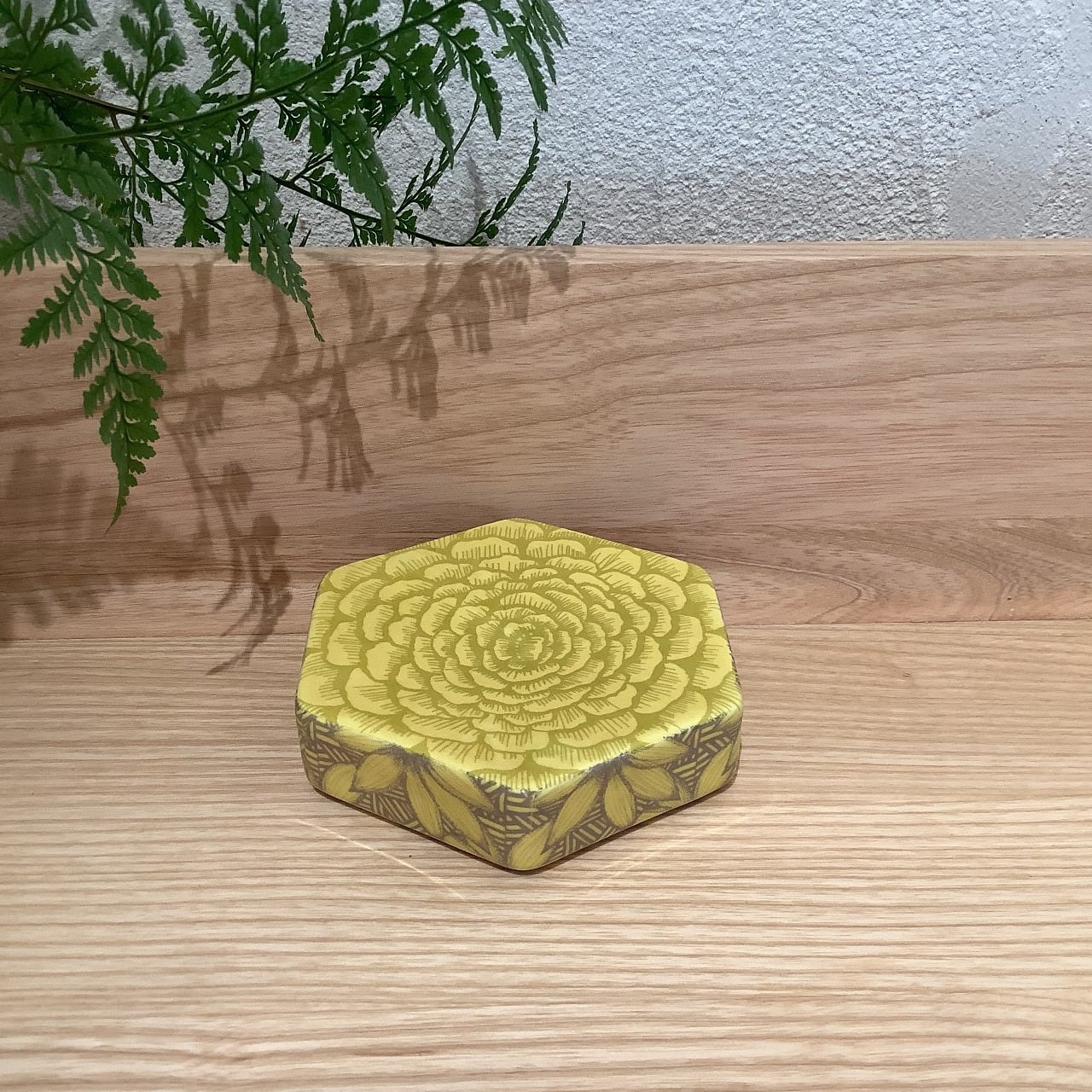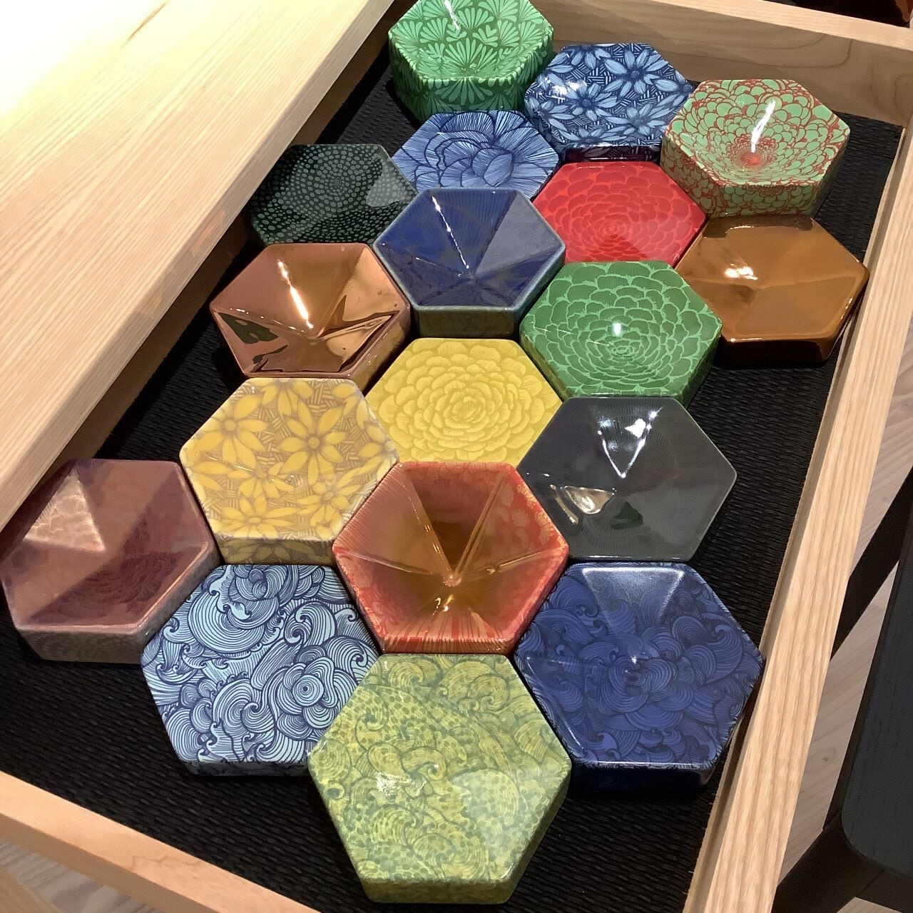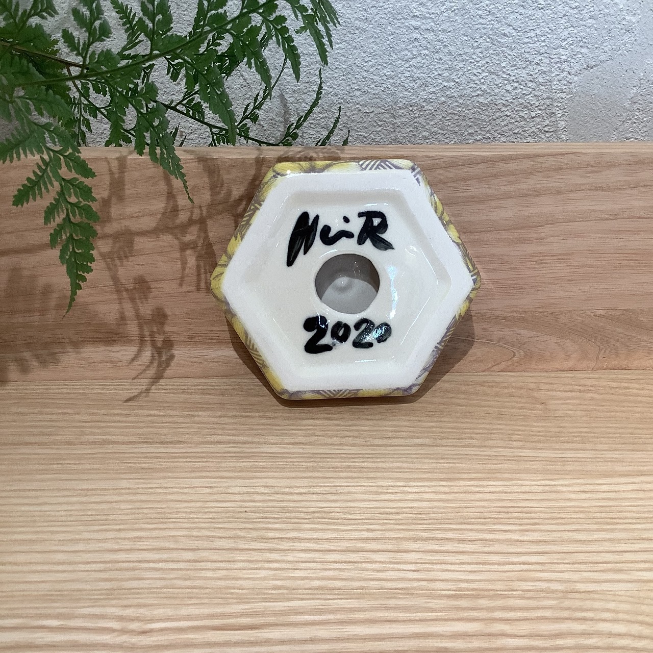 このHexagon dishはヘイニさんが頻繁に用いる六角形(ヘキサゴン)のオブジェです。他のヘキサゴンディッシュに比べて高さが低いタイプになります。ベースカラーはマスタード。側面はすべて同じパターンですが、上面と側面のパターンが違うタイプです。スレ、ピンホールの少ない綺麗な作品です。