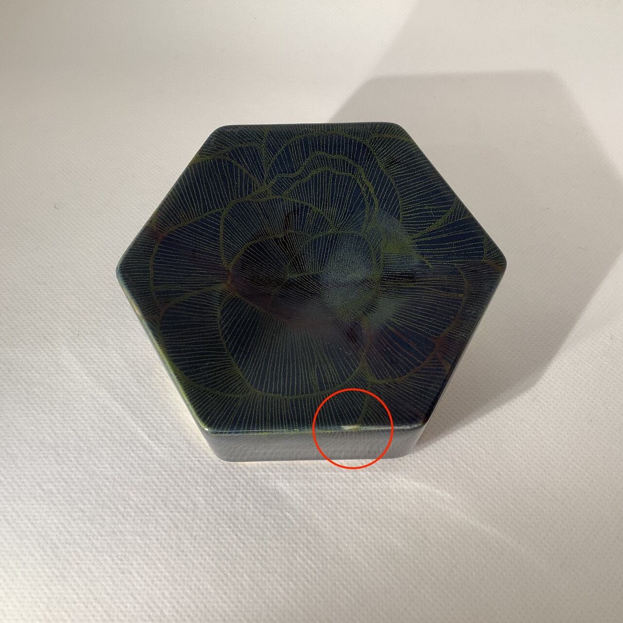 一見深いグリーンに見えるのですが、作者の意図としてはブルーイエロー。藍に近い濃いブルーをベースに、エンジの部分を入れ、パターンは黄色とオレンジ。これが深緑に見えます。艶感、佇まいとも落ち着いた雰囲気がショップでも人気です。分かりにくいですが、一部ヘリの部分に色落ちがあります。お写真でご確認ください。