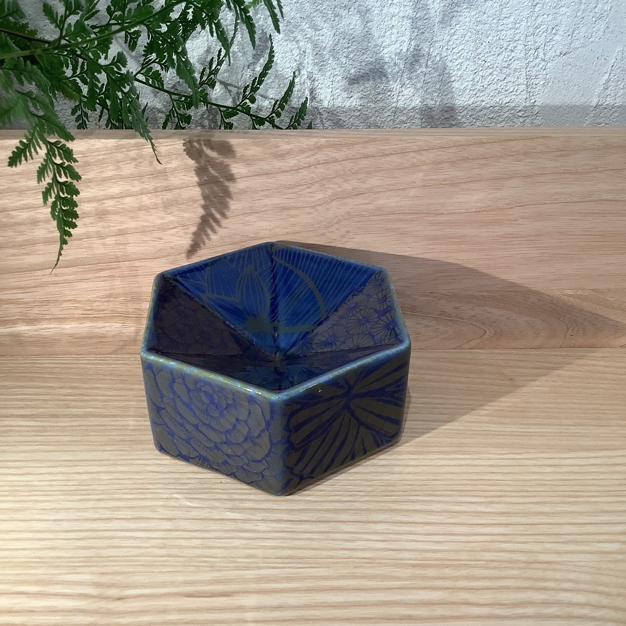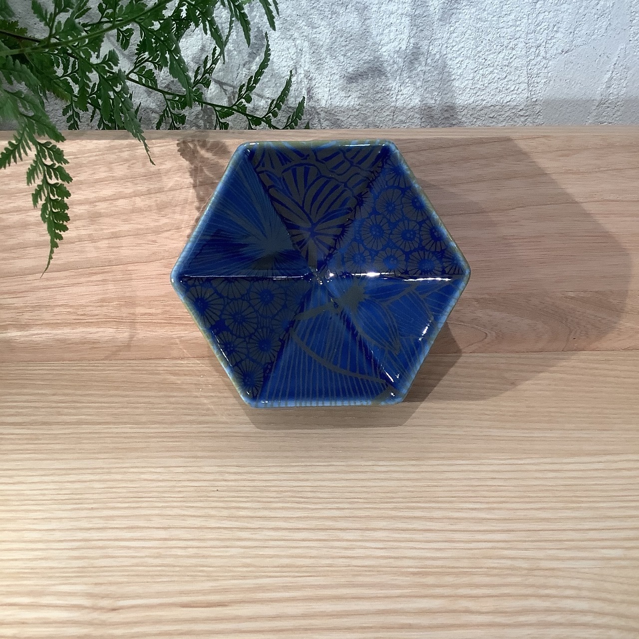 ロイヤルブルーのベース色に褐色の模様の組みあわせです。模様はディッシュを傾けると出てくる程度の控えめな色合いなので、見え方がいつも変わり発見があります。