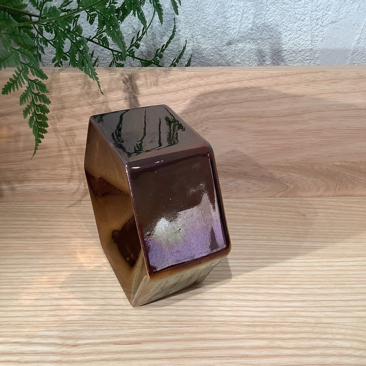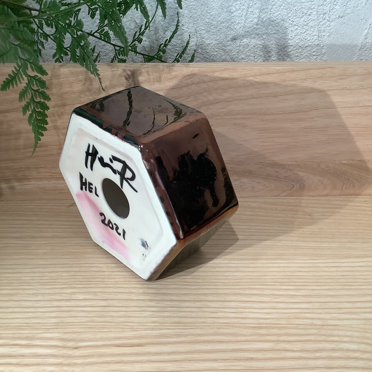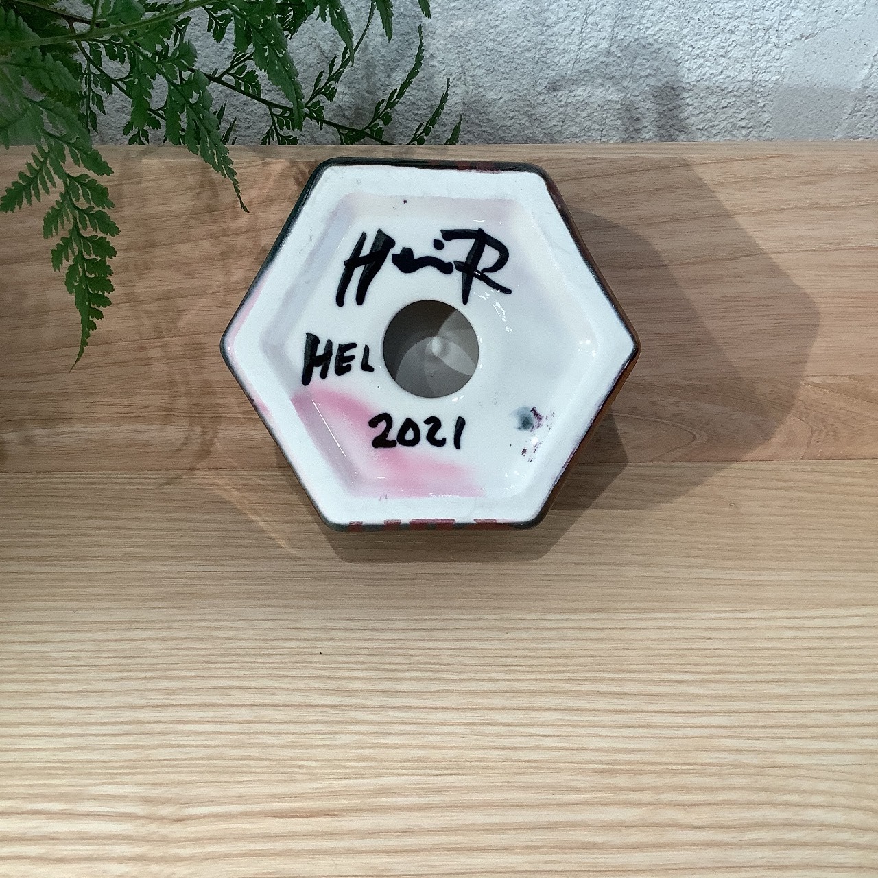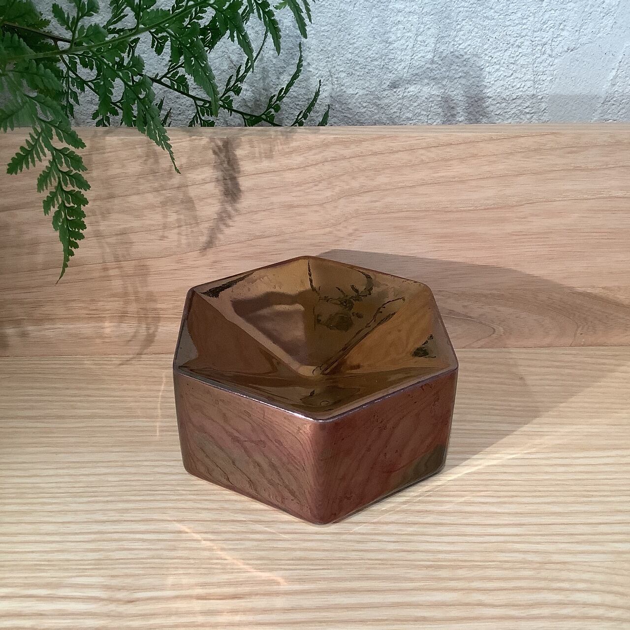 このHexagon dishはヘイニさんがずっと挑戦し続けているメタルシリーズのカッパーです。制作過程で銅をたっぷりと焼き込んでいます。このディッシュは銅とピンク色を焼き重ねています。