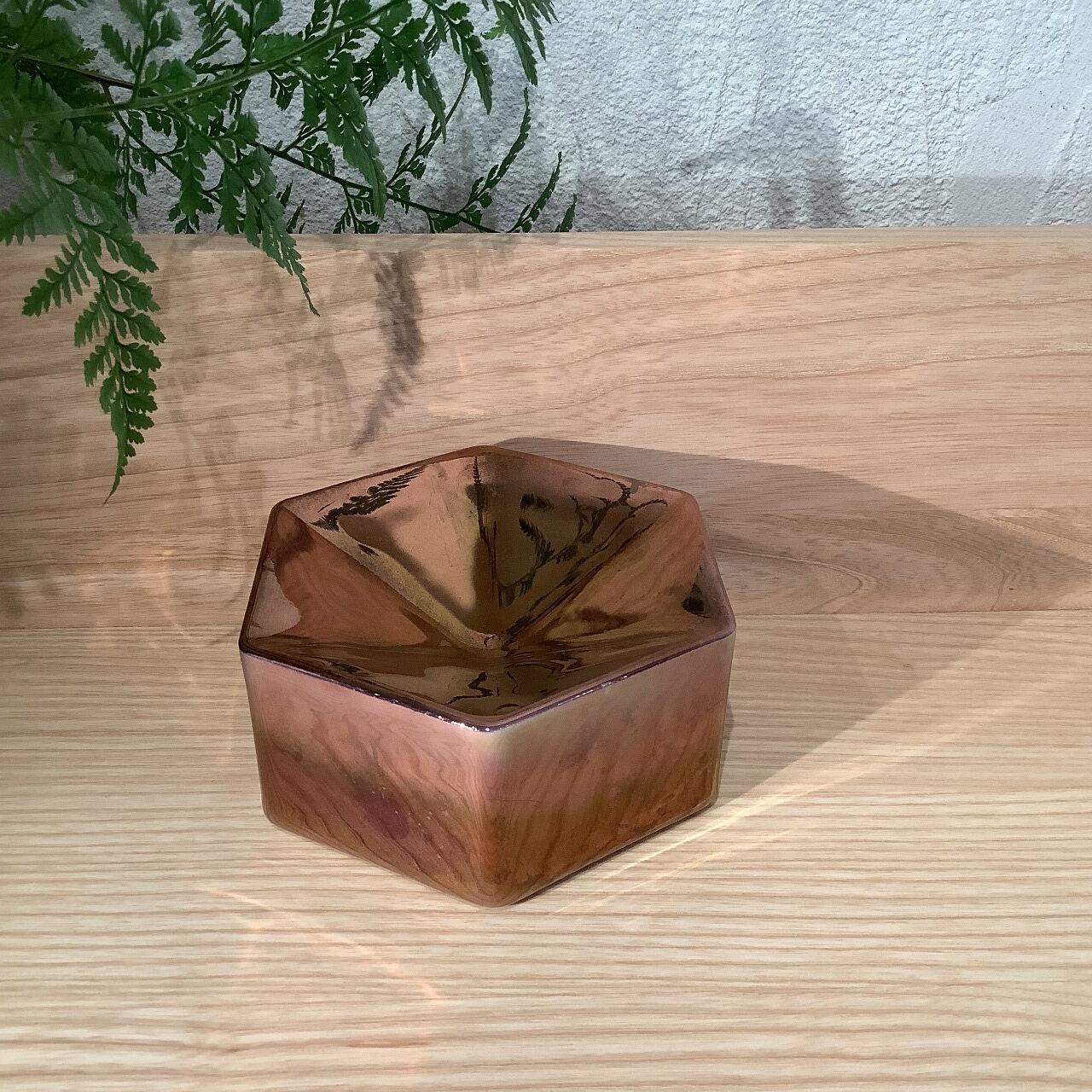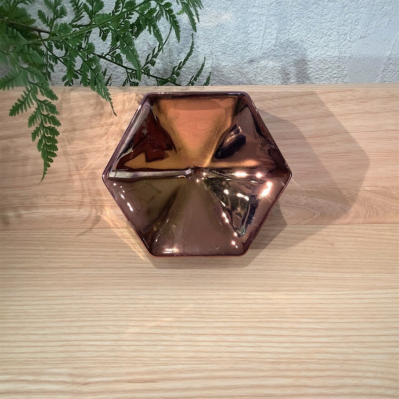 このHexagon dishはヘイニさんがずっと挑戦し続けているメタルシリーズのカッパーです。制作過程で銅をたっぷりと焼き込んでいます。
