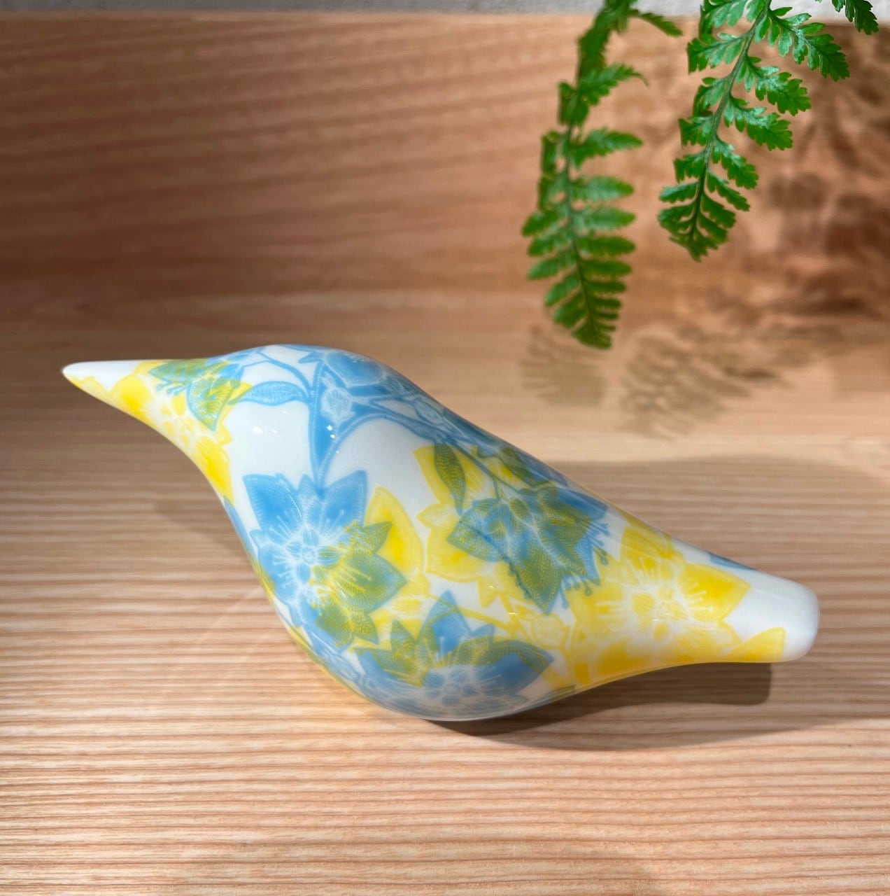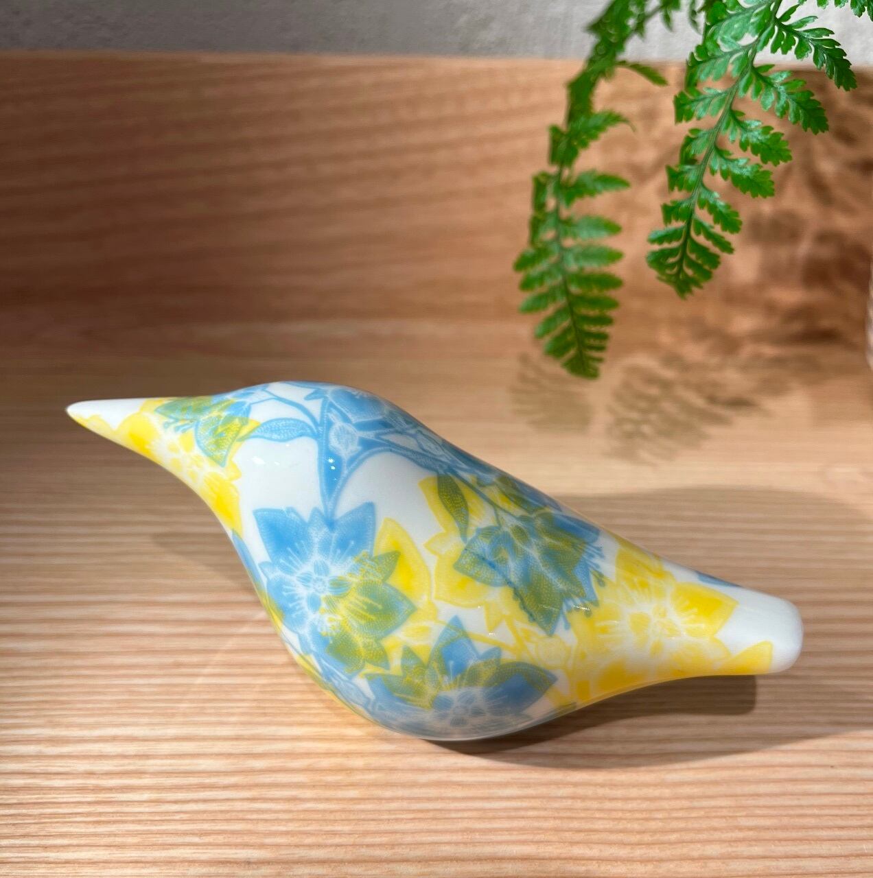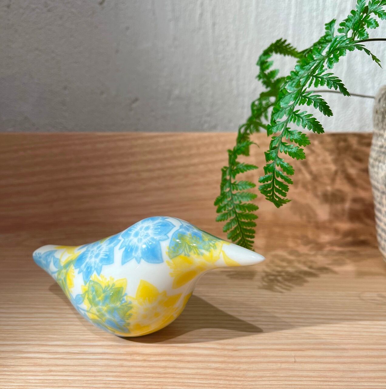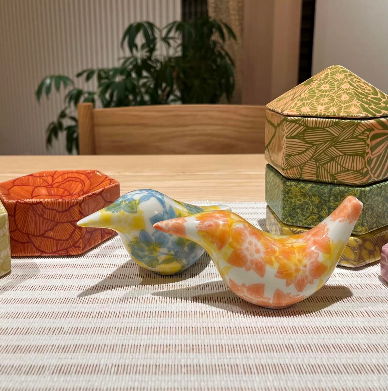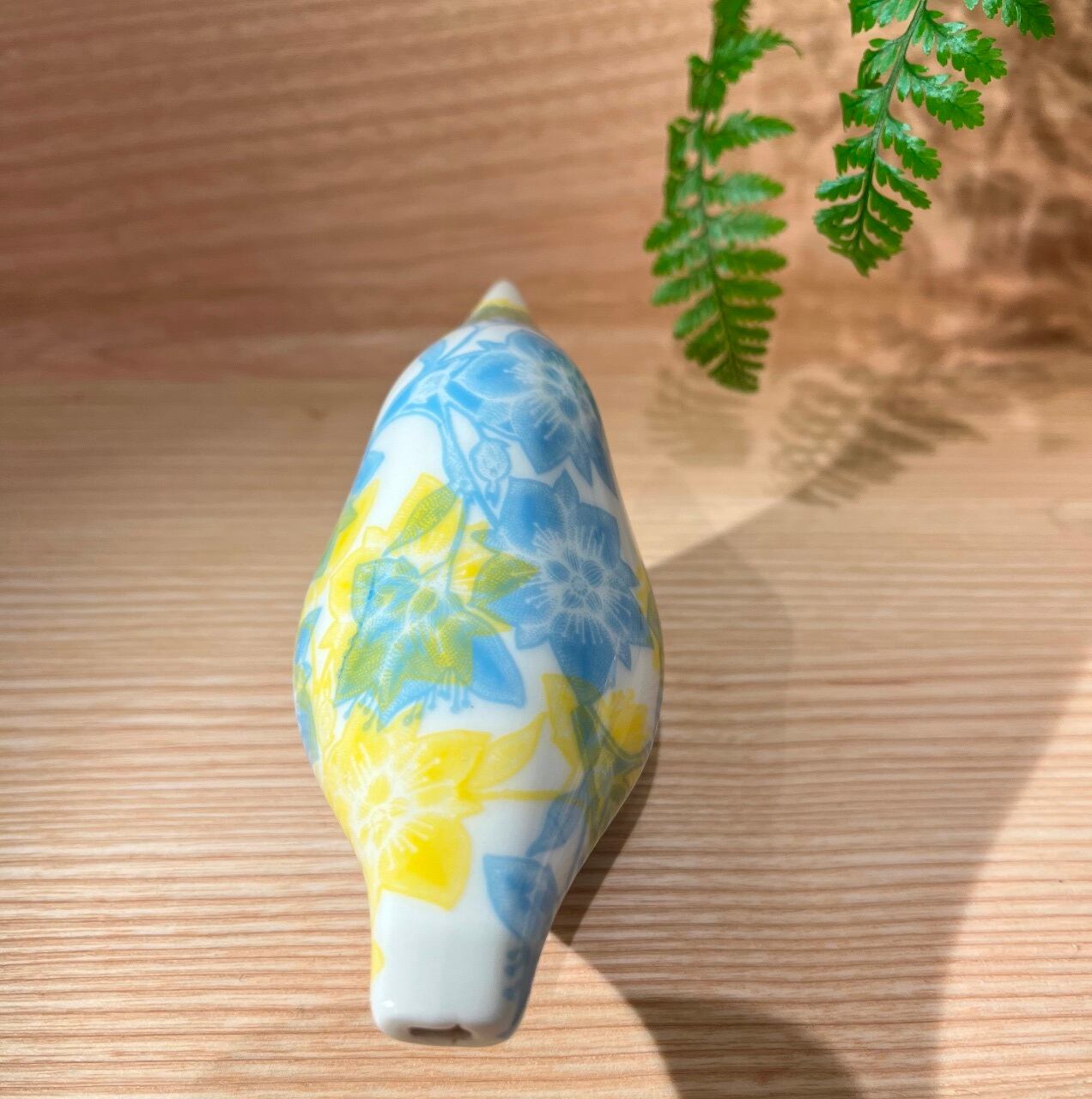 ヘキサゴンと並び作家が作り続けてきた鳥の作品です。体の模様はパターンを張り分けたり、手書きで書き込んだり、それらを何度も焼き重ねたデザインが施されています。このTiti-tyyは両手で小鳥を包んだような大きさなので手の中にすっぽり収まってとても可愛らしいです。しかも笛になっていてオカリナのようにホーホーといい音を出します。