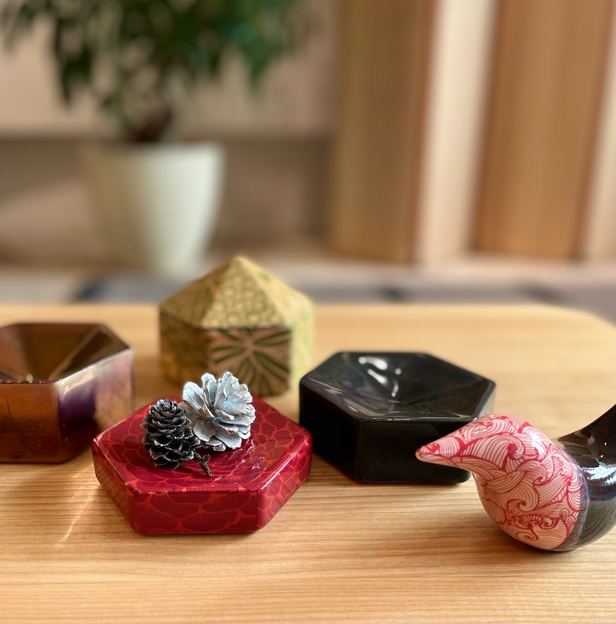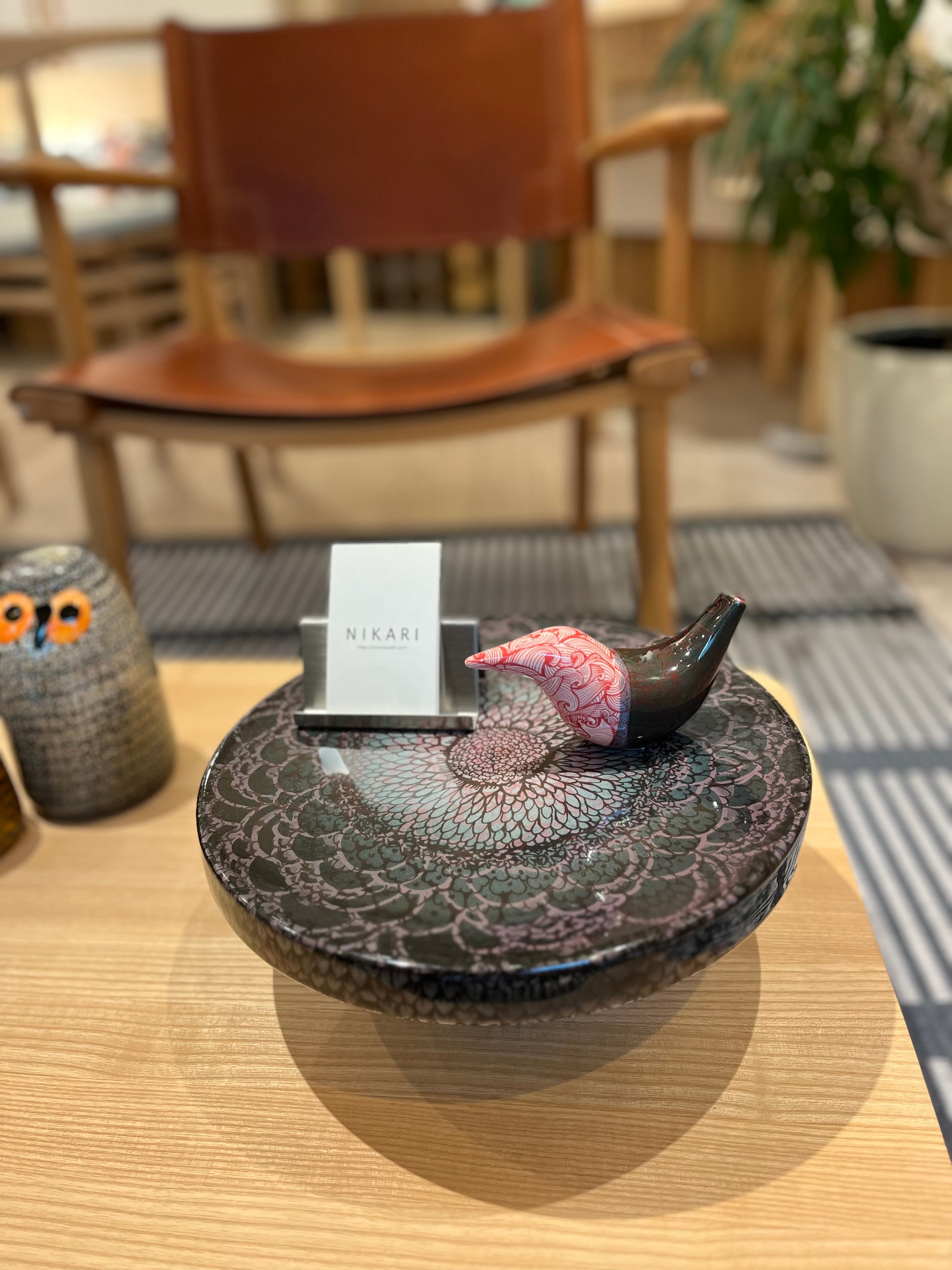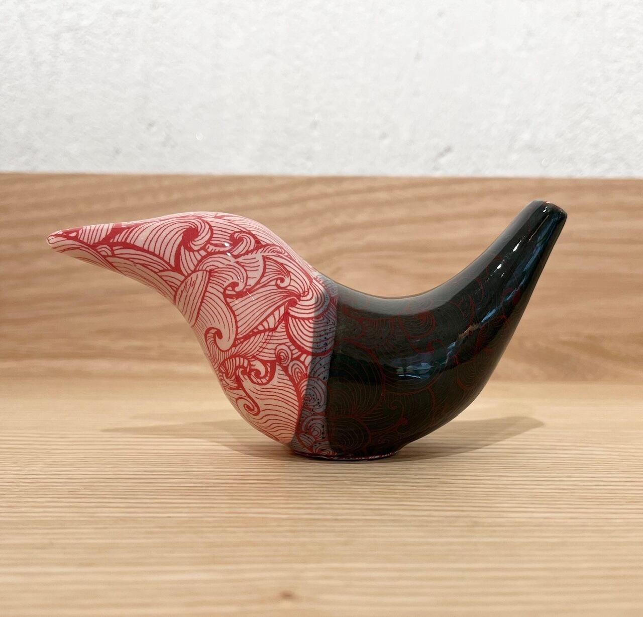 このTiti-tyyはヘキサゴンと並び作り続けてきた鳥の形をした作品です。パターンを張り分けたり、手書きで書き込んだり何度も焼き重ねてできたTiti-tyyは、両手で小鳥を包んだような大きさでとても可愛らしいのです。しかも笛になっていてオカリナのようにホーホーといい音を出します。作家の特色をよく現した色合いで、頭が白、お腹が少しグレー、尻尾はチャコールグレーの下地に、紅の波パターンがとてもシックに映えます。